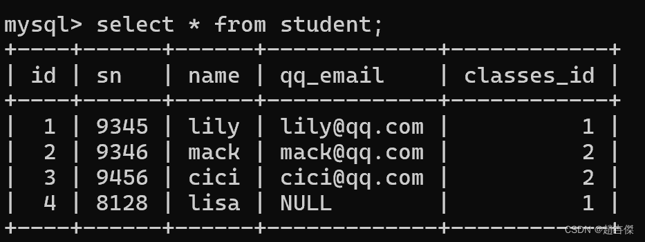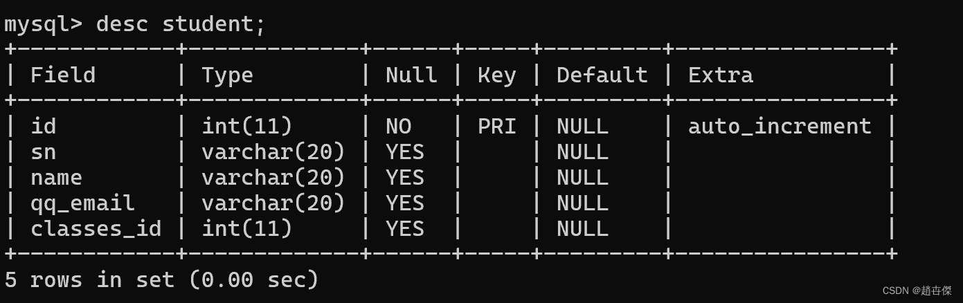 create table student(id int primary key auto_increment,sn varchar(20),name varchar(20),qq_email varchar(20),classes_id int);