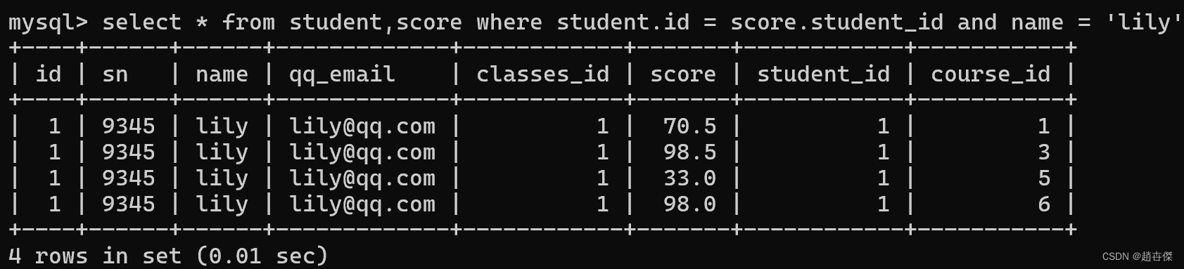 select * from student,score where student.id = score.student_id and name = 'lily';