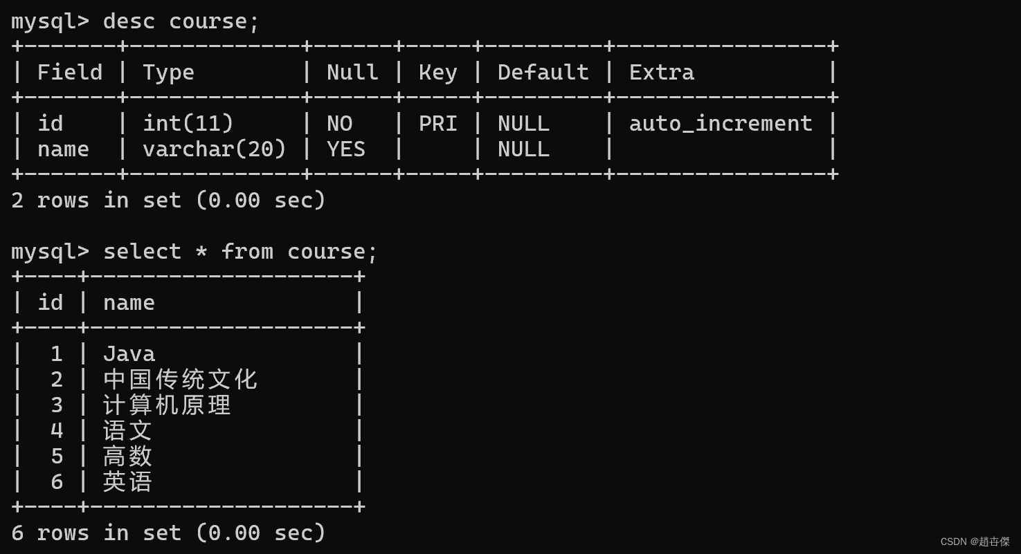 insert into course values(1,'Java'),(2,'中国传统文化'),(3,'计算机原理'),(4,'语文'),(5,'高数'),(6,'英语')
