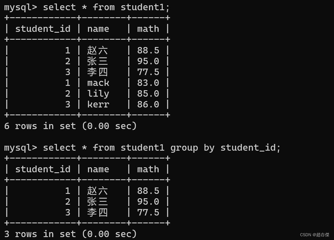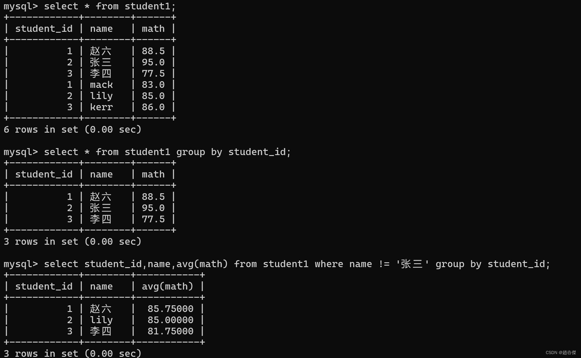 select student_id,name,avg(math) from student1 where name != '张三' group by student_id;