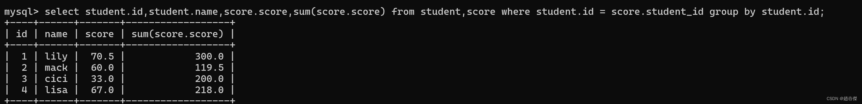 select student.id,student.name,score.score,sum(score.score) from student,score where student.id = score.student_id group by student.id;