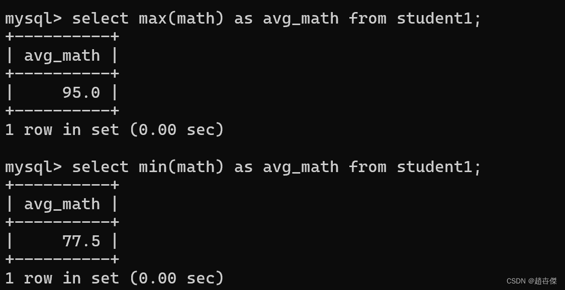 MAX([DISTINCT] expr) 返回查询到的数据的 最大值,不是数字没有意义 MIN([DISTINCT] expr) 返回查询到的数据的 最小值,不是数字没有意义