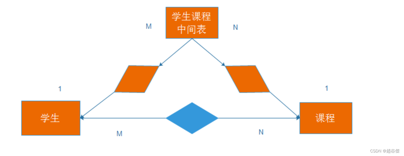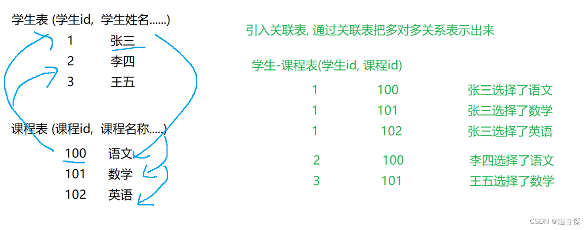 多对多关系 一个学生可以选择多门课程,一门课程也可以被多个学生选中 此时就需要创建一个中间表,使用联合主键来引用课程表和学生表