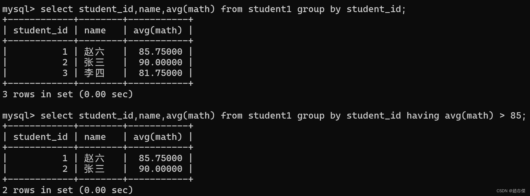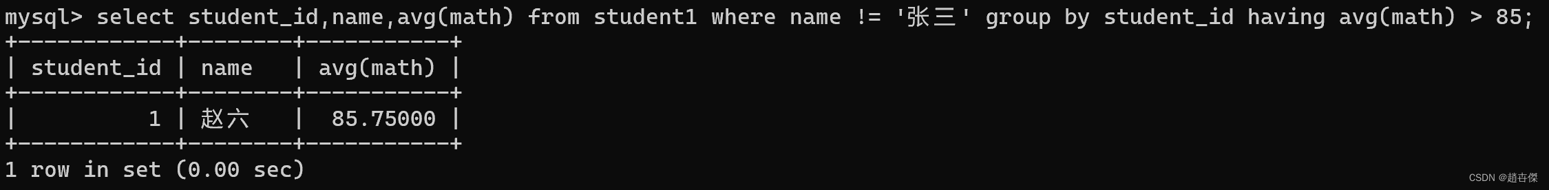 select student_id,name,avg(math) from student1 where name != '张三' group by student_id having avg(math) > 85;