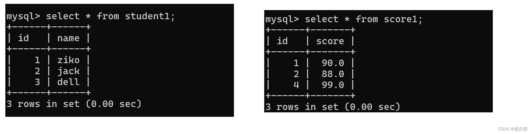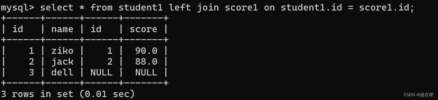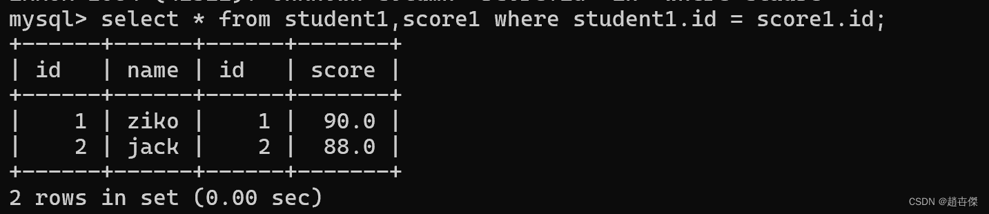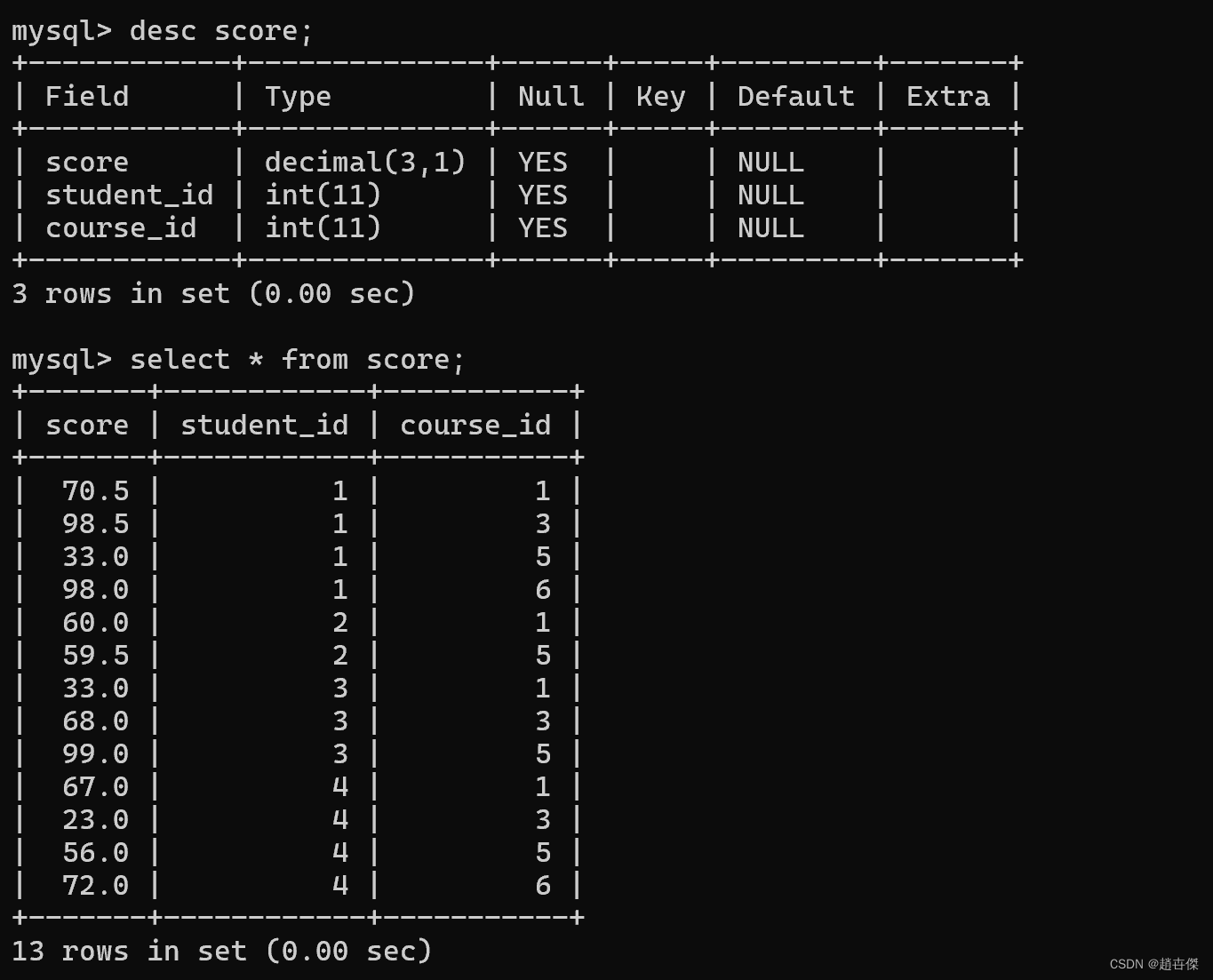 select * from score as s1, score as s2 where s1.student_id = s2.student_id and s1.course_id = 1 and s2.course_id = 3 and s1.score < s2.score;子查询是指嵌入在其他sql语句中的select语句,也叫嵌套查询 如果当前发现,要查询的条件,是针对两行,而不是两列就可以考虑使用自连接,进行转换.