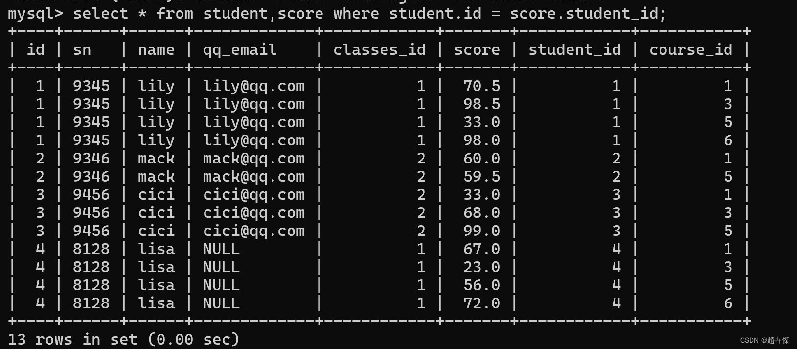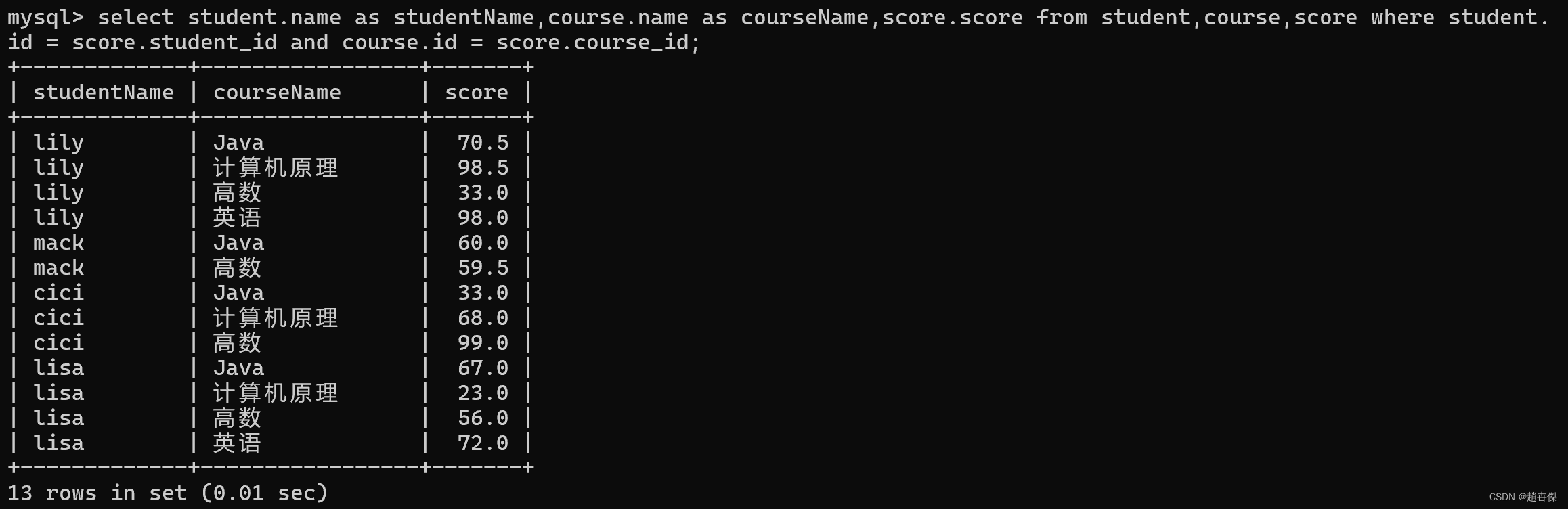 select * from student,course,score where student.id = score.student_id and course.id = score.course_id;
