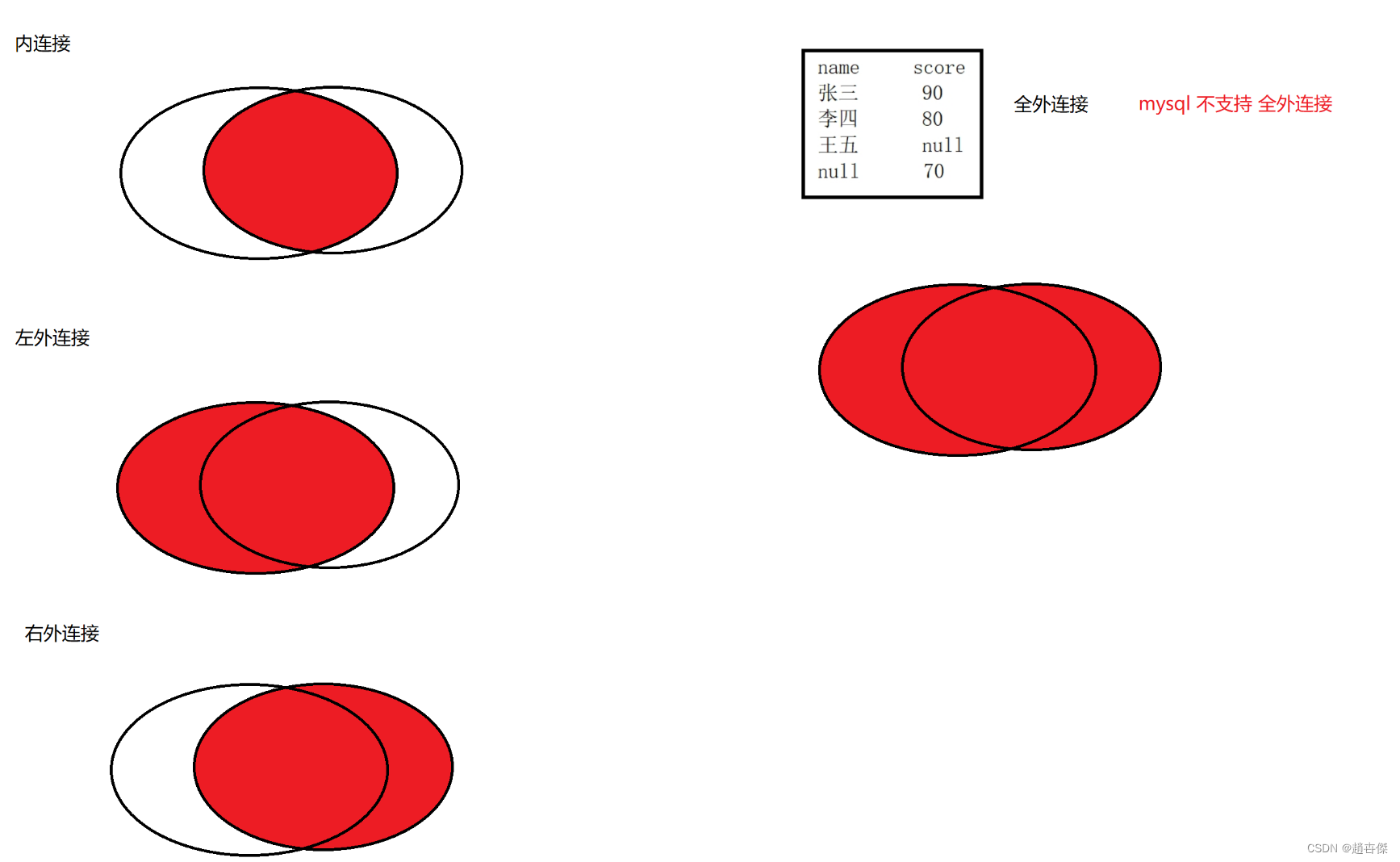 外连接分为左外连接和右外连接。如果联合查询,左侧的表完全显示我们就说是左外连接;右侧的表完 全显示我们就说是右外连接。 外连接不支持from多个表