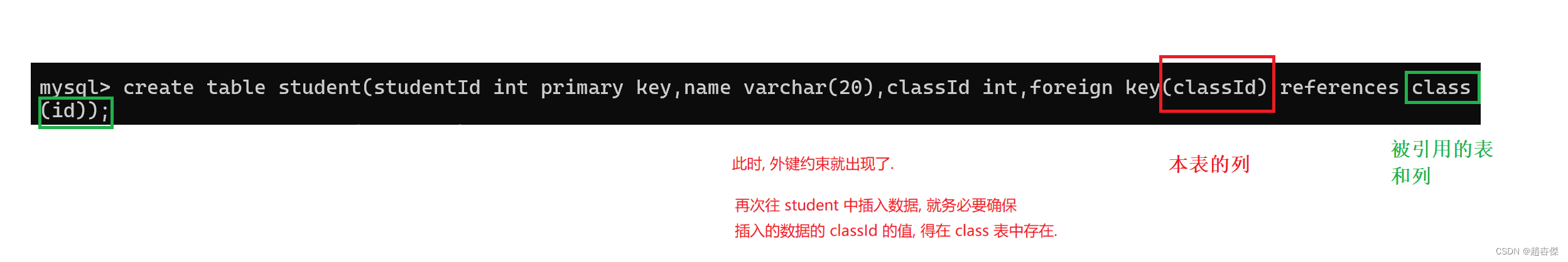 create table student(studentId int primary key,name varchar(20),classId int,foreign key(classId) references class(id));