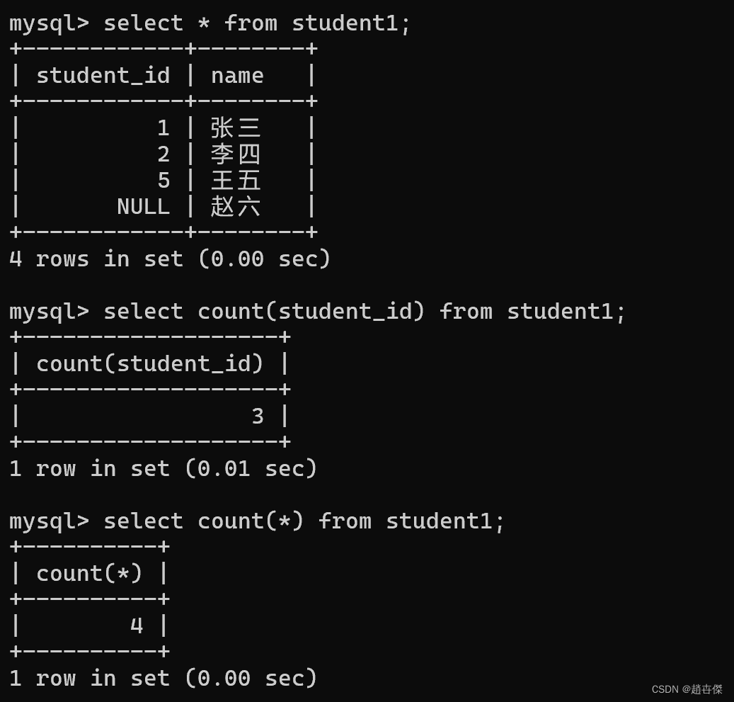 COUNT([DISTINCT] expr) 返回查询到的数据的数量 注: count和()之间没有空格 如果是select列名的方式,遇到空值,不会进行计数