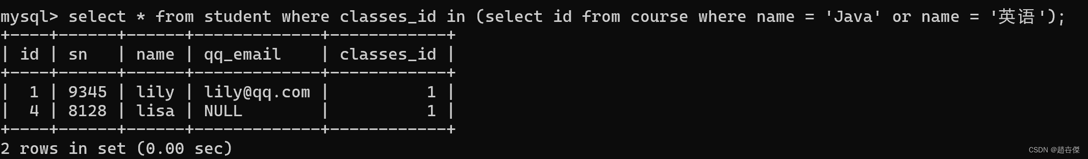 select * from student where classes_id in (select id from course where name = 'Java' or name = '英语');