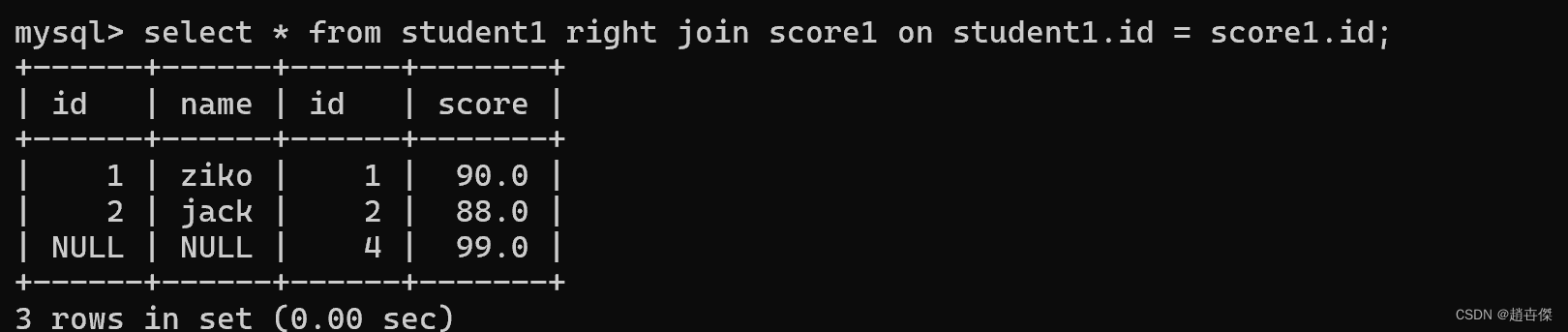select 字段 from 表名1 right join 表名2 on 连接条件;此时两个表的数据不是一一对应的,相应的外连接内连接就会产生不同的效果