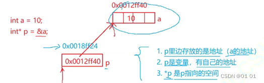 *p = 1;1.p里面存放的是a的地址 2.p本身是变量有自己的地址 3.*p是p指向的空间,即a(通过p找到a)