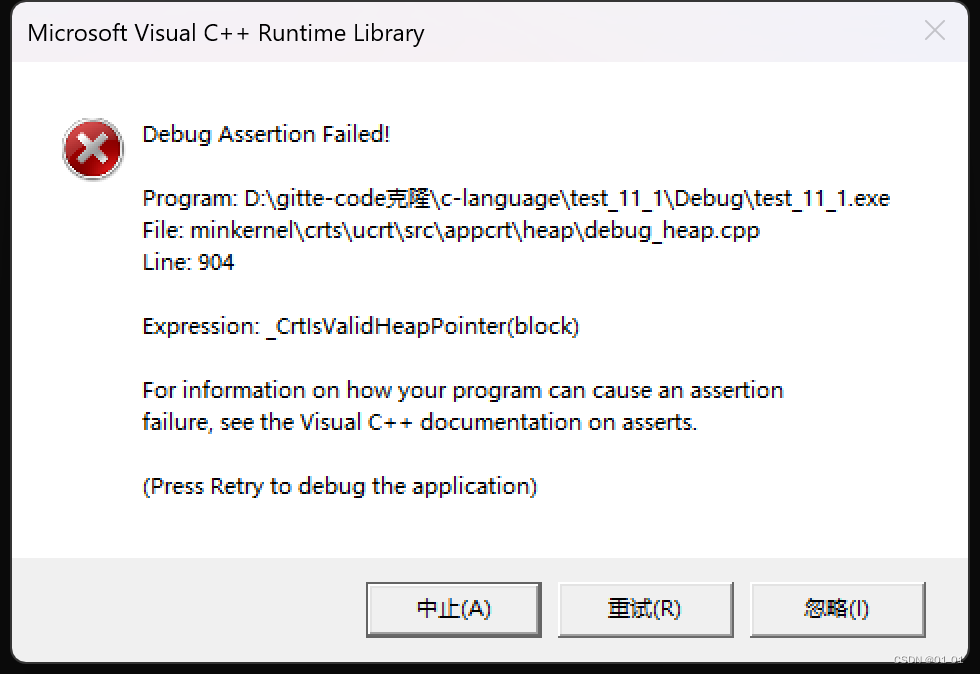 }我们最后free(p)时p指向的不是内存的初始位置,所以我们开辟的这块空间并不能完全释放,会造成内存泄漏。