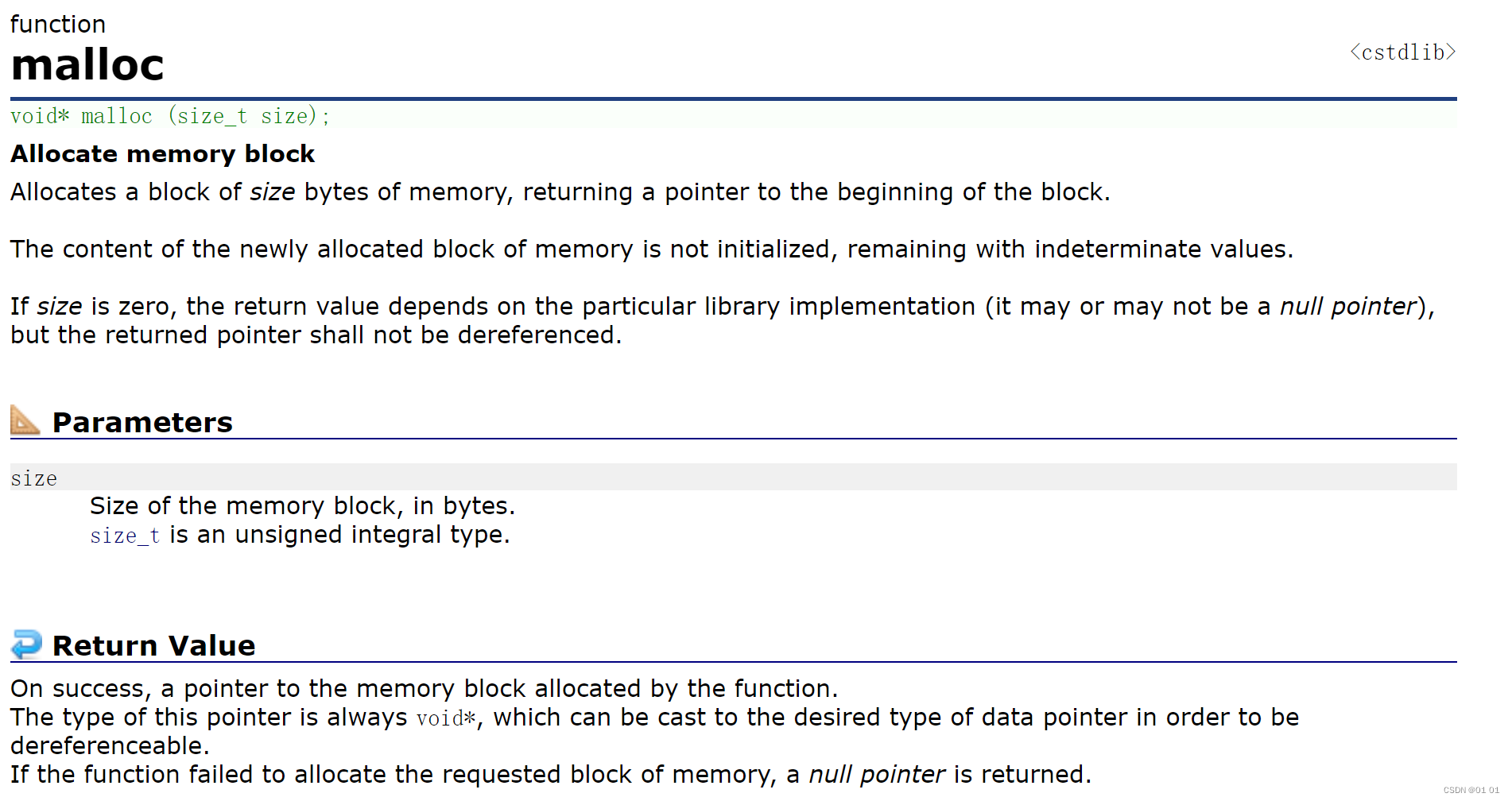 • 如果参数 size 为0,malloc的⾏为是标准是未定义的,取决于编译器。