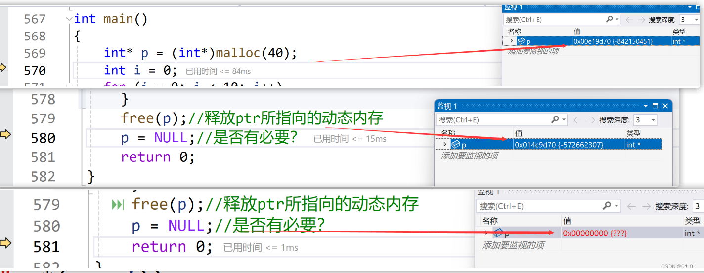}我们通过调试发现通过free函数将malloc函数开辟的空间释放后,p依然能找到这块空间,为了避免这块空间的错误使用,我们将p=NULL,赋成空指针,这样就p指针就真正的断开了与这块空间的联系。