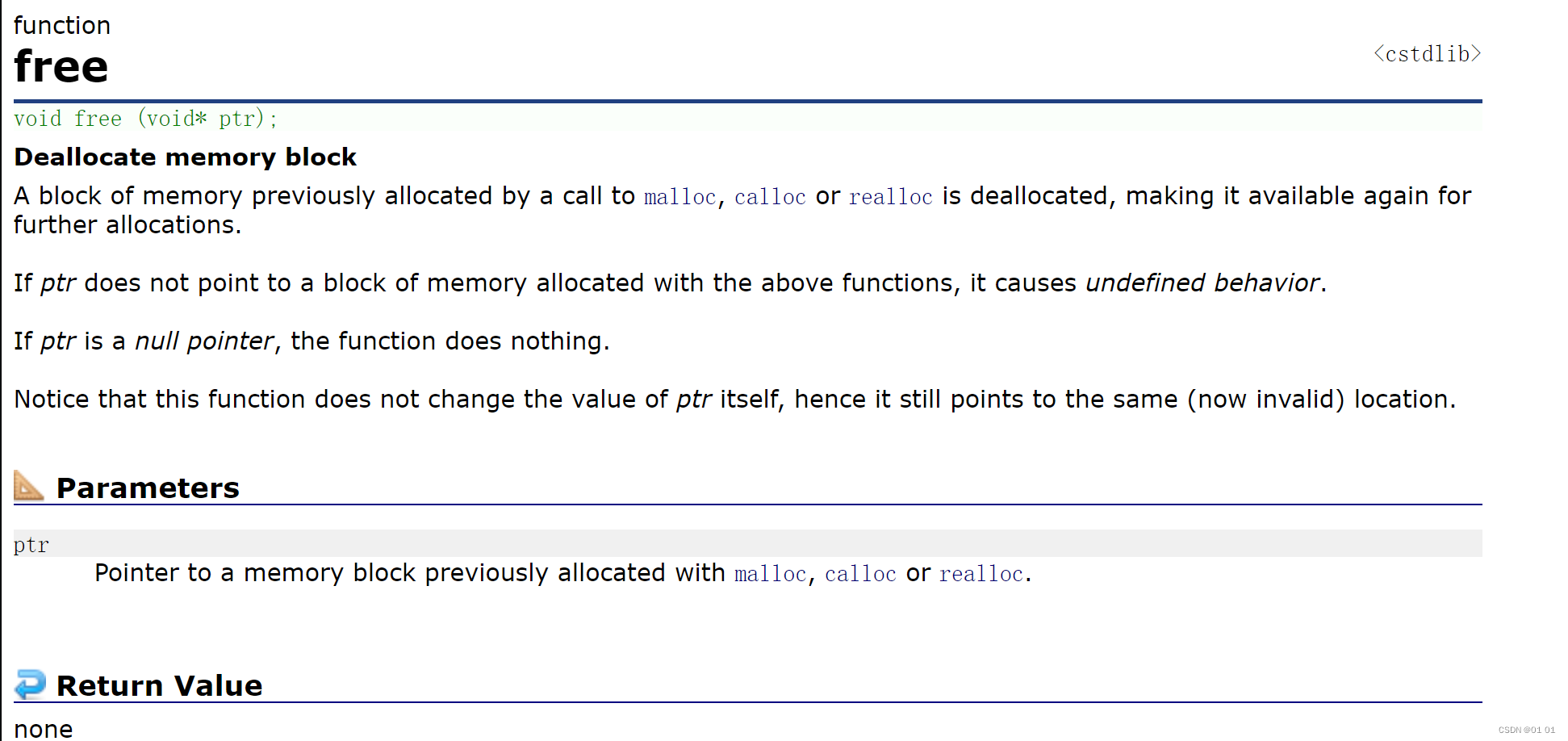 • 如果参数 ptr 是NULL指针,则函数什么事都不做。