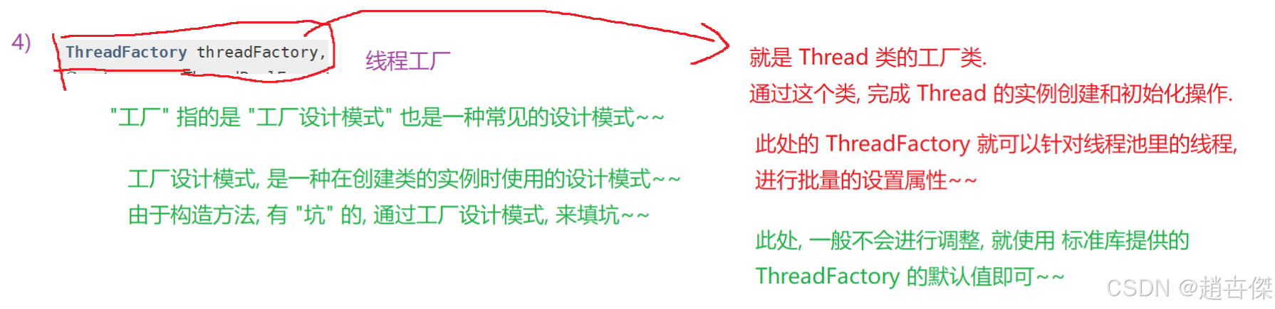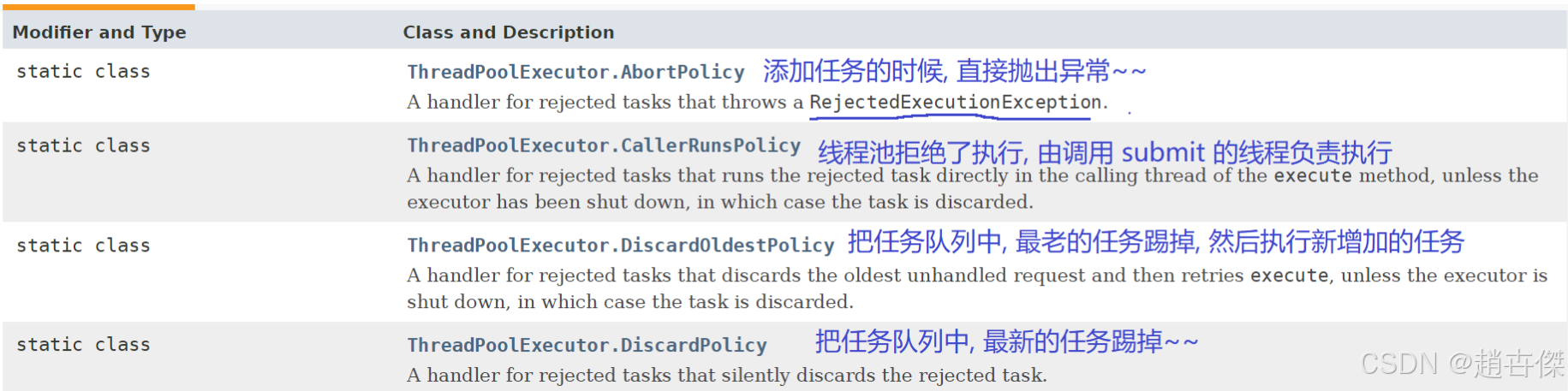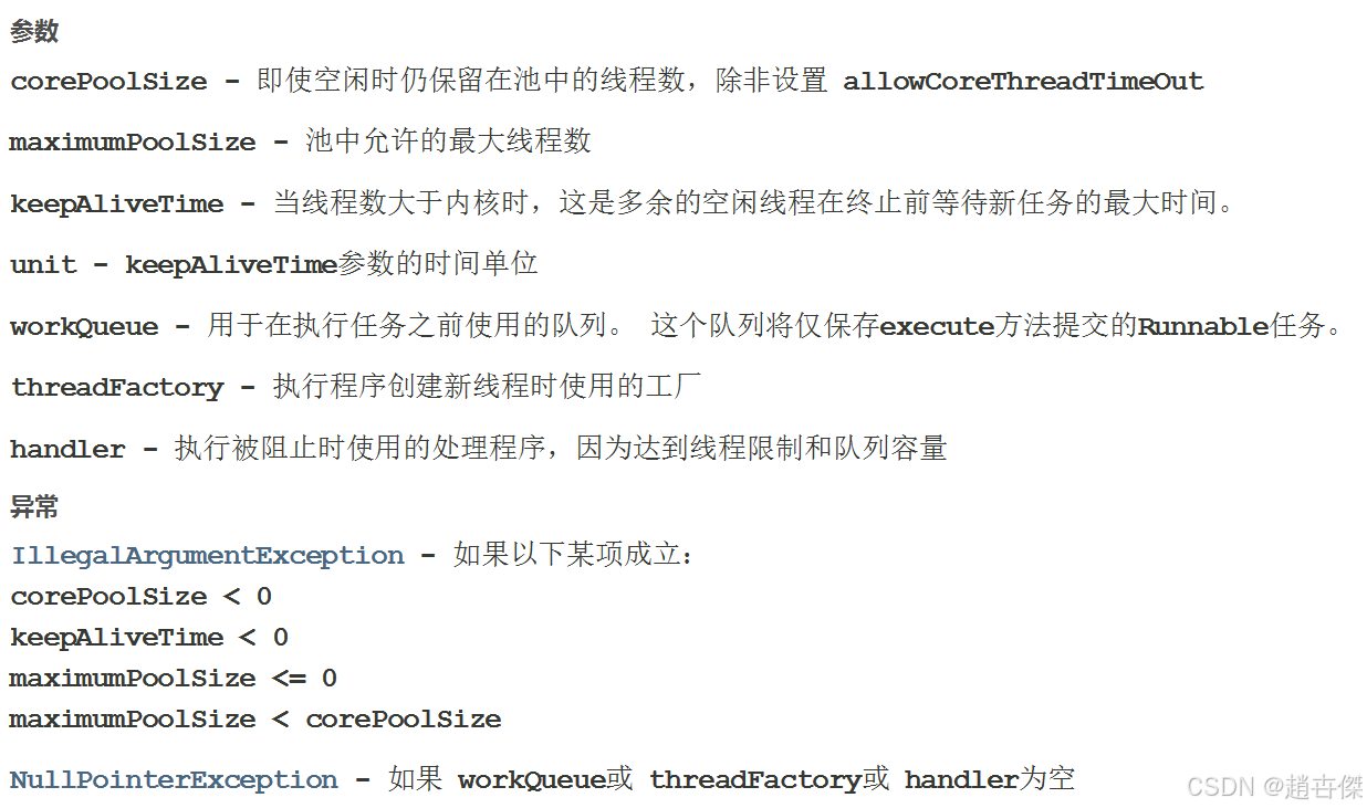 核心线程数+非核心线程数的最大值就是最大线程数 核心线程会始终存在于线程池内部,非核心线程繁忙时会被创建出来,不繁忙空闲时就会把这些线程真正释放掉 BlockingQueue<Runnable> workQueue表示工作队列,线程池的工作过程是典型的“生产者消费者模型”,我们在使用时通过形容submit这样的方法把要执行的任务(Runnable)设定到线程池里,线程池内部的工作线程就负责执行这些任务