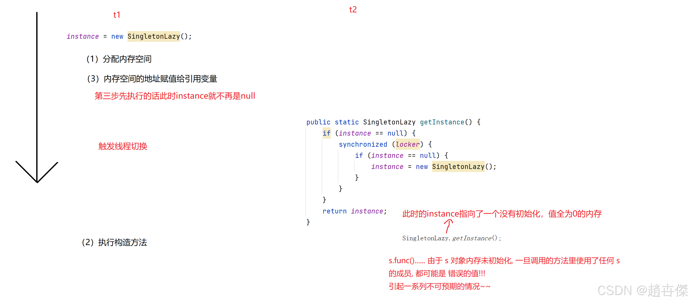 }此时依然存在问题,我们上篇文章说过开发编译器的大佬们为了提高大家的效率会进行优化,这里就进行了指令重排序,从而引起了线程安全问题,此时为了防止误判,我们依旧加volatile关键字进行标记即可 代码中的 instance = new SingletonLazy();可分为三步