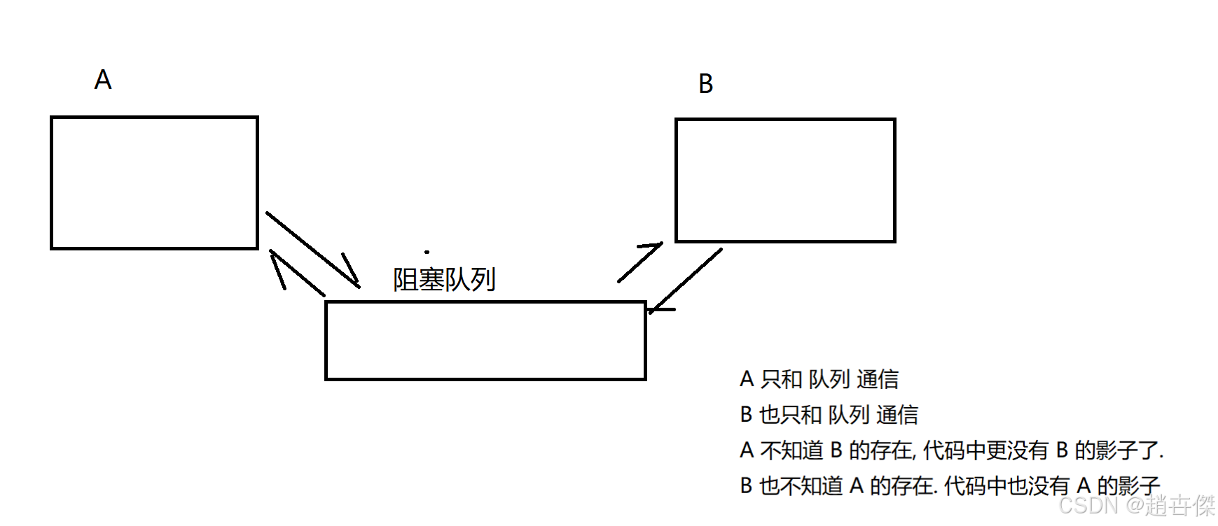 此时AB之间通过阻塞队列,达到了解耦合的效果,但是A和队列,B和队列之间是否又引入了新的耦合呢?答案是没有,我们通常所谈到的阻塞队列是代码中的一个数据结构,由于这个东西太好用,以至于会把这样的数据结构单独封装成一个服务器程序并且在单独的服务器机器上进行部署,此时这样的阻塞队列就叫做“消息队列”(Message Queue,MQ),消息队列是成熟的产品,代码不会频繁修改,代码是稳定的,所以相互之间的逻辑基本一次就顶下来了