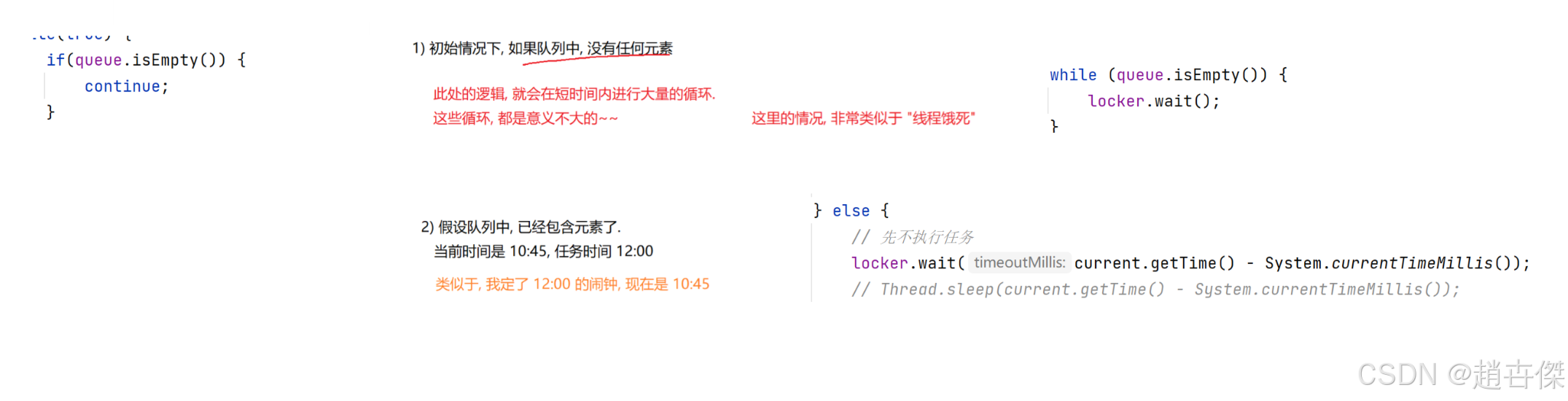 原因:因为wait并非只能被notify来唤醒,还可能被interrupt方法以打断的方式来唤醒 while的作用就是在wait被唤醒之后再次确认条件,看是否能继续执行