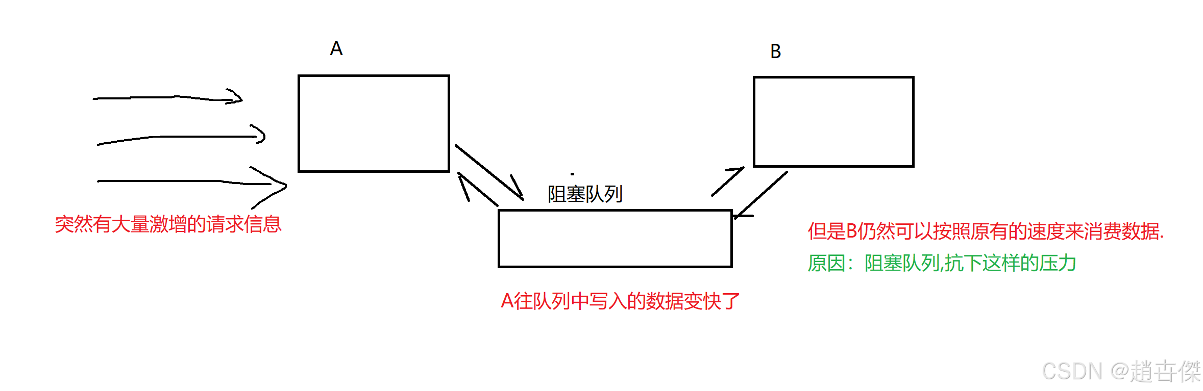 在请求激增的时候,A为啥不会挂?队列为啥不会挂?反而是B更容易挂呢?? A的角色是一个“网关服务器”,收到客户端的请求再把请求转发给其他服务器,这样服务器里面的代码做的工作比较简单(单纯的数据转发)消耗的硬件资源通常更少,因此在处理同一个请求时,消耗的资源更少,同样的配置下就能支持更多的请求处理, 同理,队列其实也是比较简单的程序,单位请求消耗的硬件资源也是比较少的 B这个服务器是真正工作的服务器,要真正完成一系列的业务逻辑,这一系列的工作代码量非常大,消耗的时间很多,消耗的硬件资源也是更多的