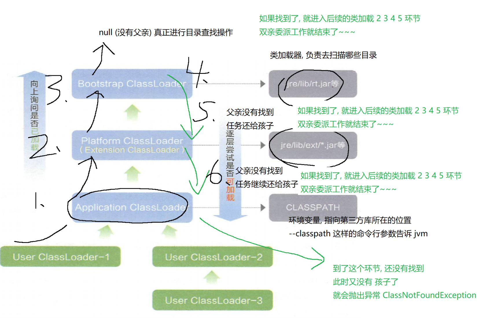 类加载五个步骤中第一个步骤中的一个环节 规定了类加载器如何协作加载 Java 类,主要目的是确保 Java 核心类的安全性和唯一性。简单来说,就是 “遇到类加载请求时,先让父加载器尝试加载,父加载器无法加载时才由自己加载”。 拿着类的全限定名(类似java.lang.String,包名+类名),通过 “父加载器优先尝试” 的规则,最终找到并加载对应的