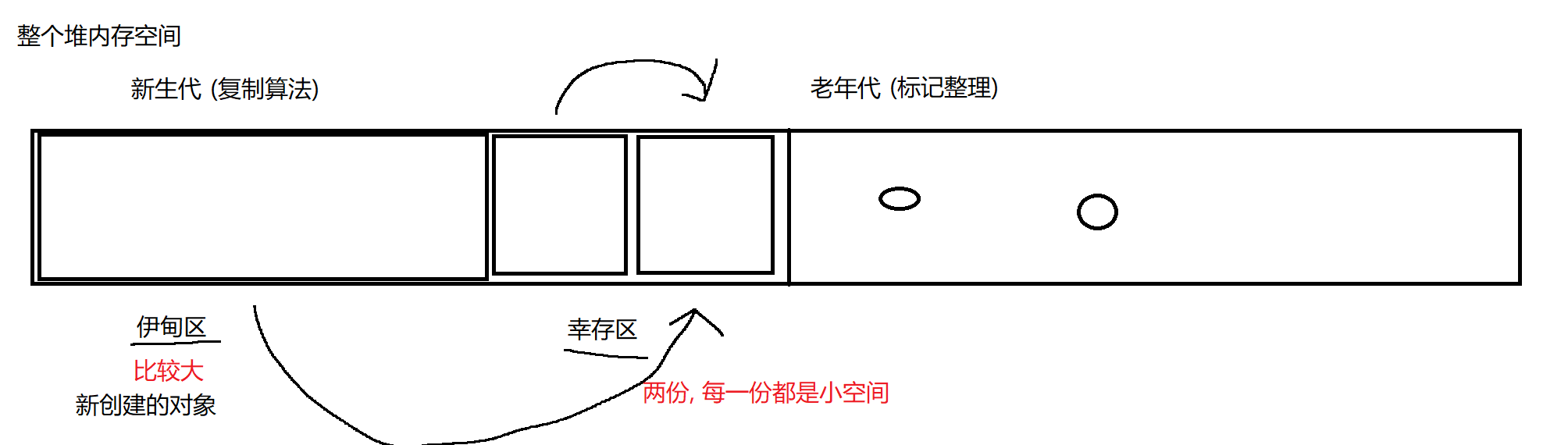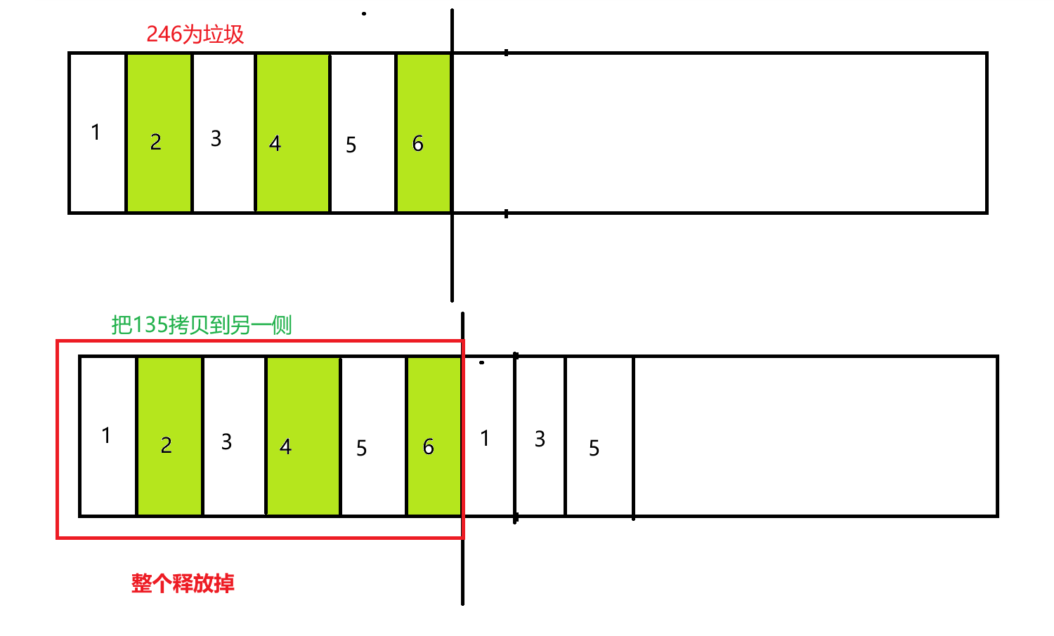 为了解决标记清除算法的效率和内存碎片问题,复制收集算法就出现了,它可以将内存分为大小相同的两块,每次使用其中的一块,当这一块的内存使用完后,就将还存活的对象复制到另一块去,然后再把使用的空间一次清理掉,这样就使每次的内存回收都是对内存区间的一半进行回收
