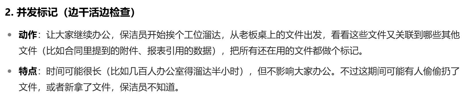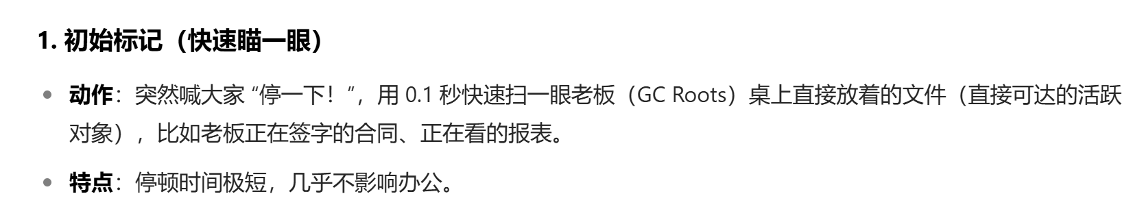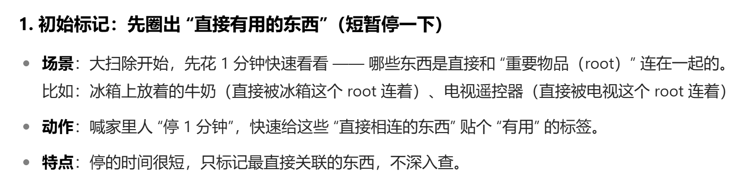 CMS收集器的运作步骤 把 GC(垃圾回收)想象成 “家里大扫除”,root 对象就是 “必须留着的重要东西”(比如冰箱、电视),其他东西是不是垃圾,得看和这些重要东西有没有关联