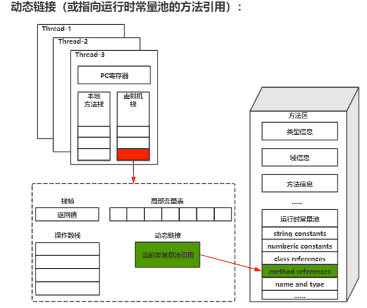 动态链接 主要服务一个方法需要调用其他方法的场景。Class 文件的常量池里保存有大量的符号引用比如方法引用的符号引用。当一个方法要调用其他方法,需要将常量池中指向方法的符号引用转化为其在内存地址中的直接引用。动态链接的作用就是为了将符号引用转换为调用方法的直接引用,这个过程也被称为 动态连接 。 假设你要找 “隔壁部门那个戴眼镜的小张”—— 这是个 “符号引用”(用特征描述一个人,但不知道具体座位)。 但你不知道他具体在哪,于是问前台,前台告诉你 “他在 3 楼 302 办公室靠窗的位置”—— 这就变成了 “直接引用”(精准地址)。 你按这个地址就能找到人,这个 “问前台→拿到精准地址” 的过程,就类似动态链接。