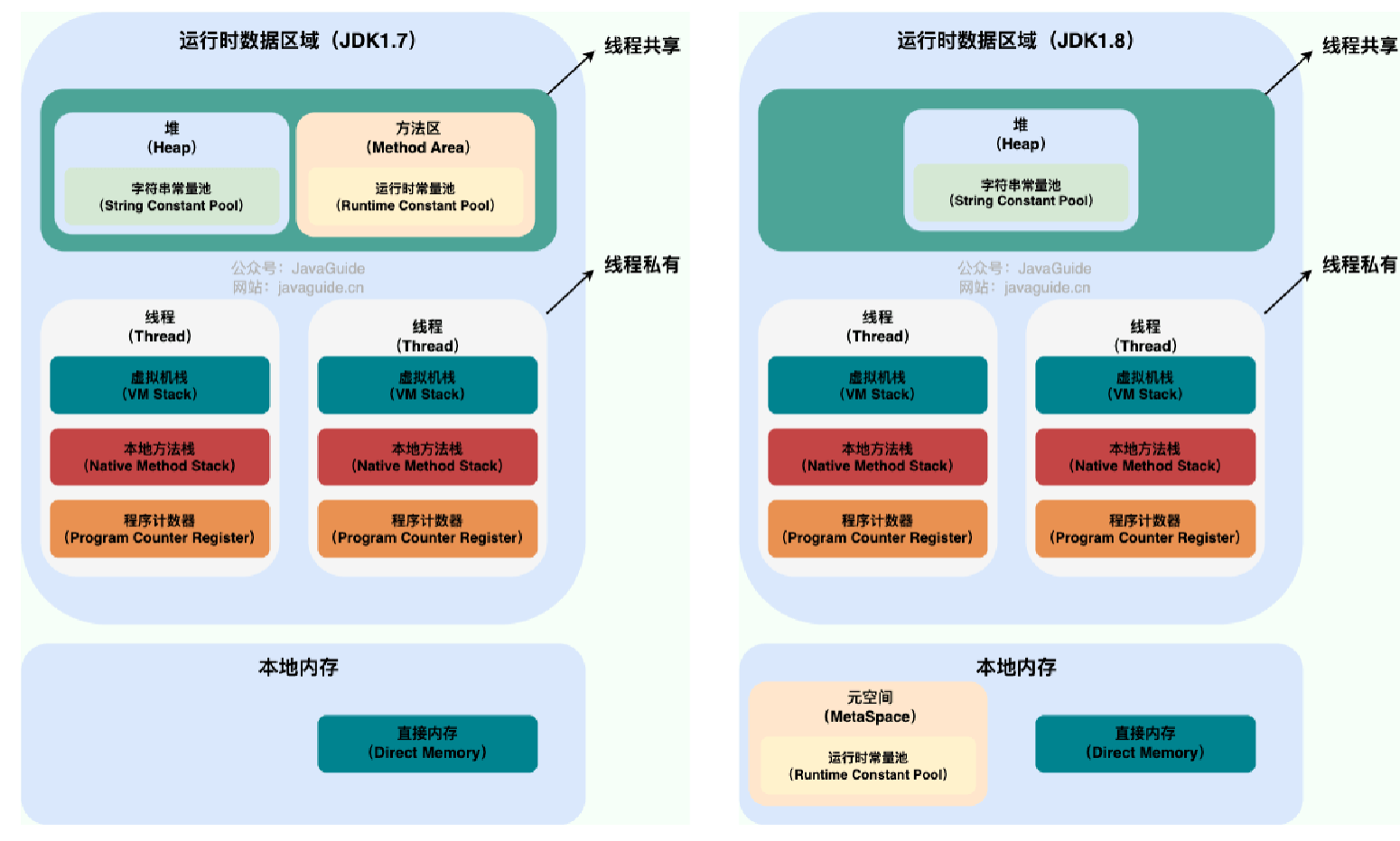 public void sayHello()),编译后变成字节码(.class 文件里的指令),由 JVM(虚拟机)直接执行。native 关键字的方法(比如 public native void start()),它的代码不是 Java 写的(可能是 C、C++),JVM 自己执行不了,得调用操作系统或其他底层语言的代码。Java 虚拟机所管理的内存中最大的一块,Java 堆是所有线程共享的一块内存区域,在虚拟机启动时创建。此内存区域的唯一目的就是存放对象实例,几乎所有的对象实例以及数组都在这里分配内存。 Java 堆是垃圾收集器管理的主要区域,因此也被称作 GC 堆(Garbage Collected Heap)。从垃圾回收的角度,由于现在收集器基本都采用分代垃圾收集算法,所以 Java 堆还可以细分为:新生代和老年代;再细致一点有:Eden、Survivor、Old 等空间。进一步划分的目的是更好地回收内存,或者更快地分配内存。