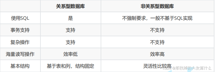 非关系型数据库: (了解) 不规定基于SQL实现。现在更多是指NoSQL数据库,如: