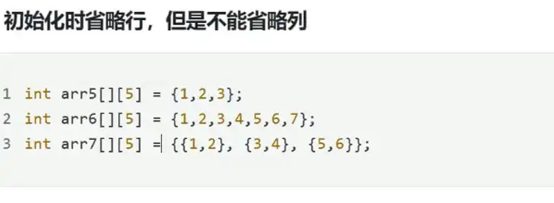 二维数组初始跟一维数组一样,可以部分初始化或者全部初始化,初始化可以省略行不能省略列,编译器根据初始化的内容自动初始化行