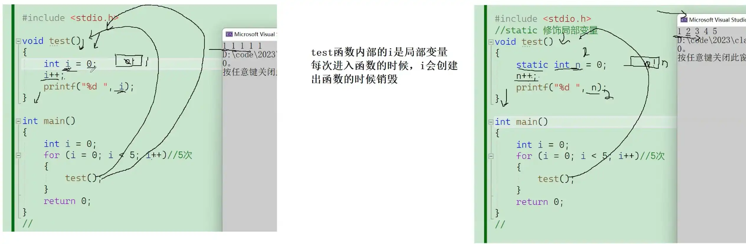 出函数时,并没有销毁,保留了上一次的值,因为上一次创建了n,下一次就不创建了和赋值(变量的存储位置/存储类型发生变化,作用域没变,只能在作用域使用)