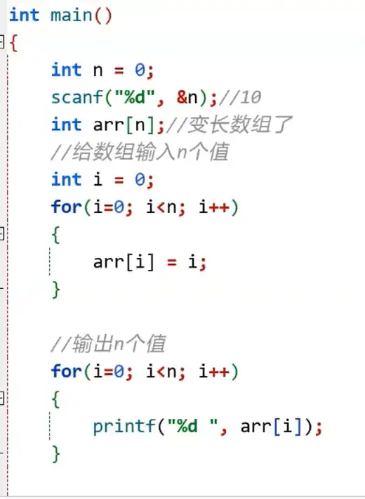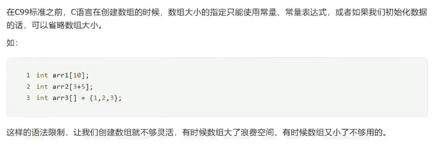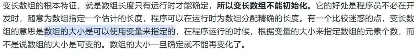 注意:变长数组不能初始化 变长数组的意思是数组的大小可以用变量来指定,一旦数组创建好后,大小就无法改变 VS上不支持变长数组的语法 变长数组一定是在运行时确定的,一旦确定大小,不能改变