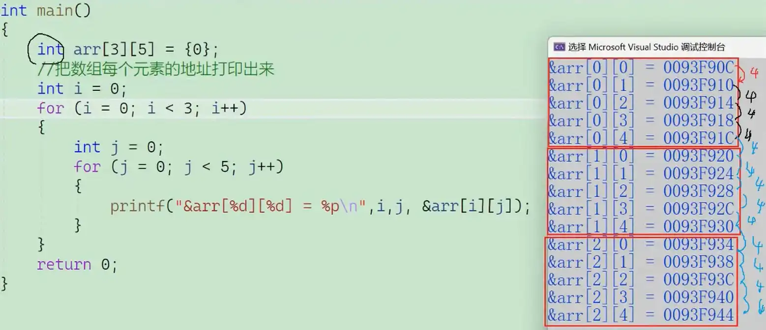 有图可以得到:数组是连续存放的 随着下标增长,地址由低(小)变高(大)