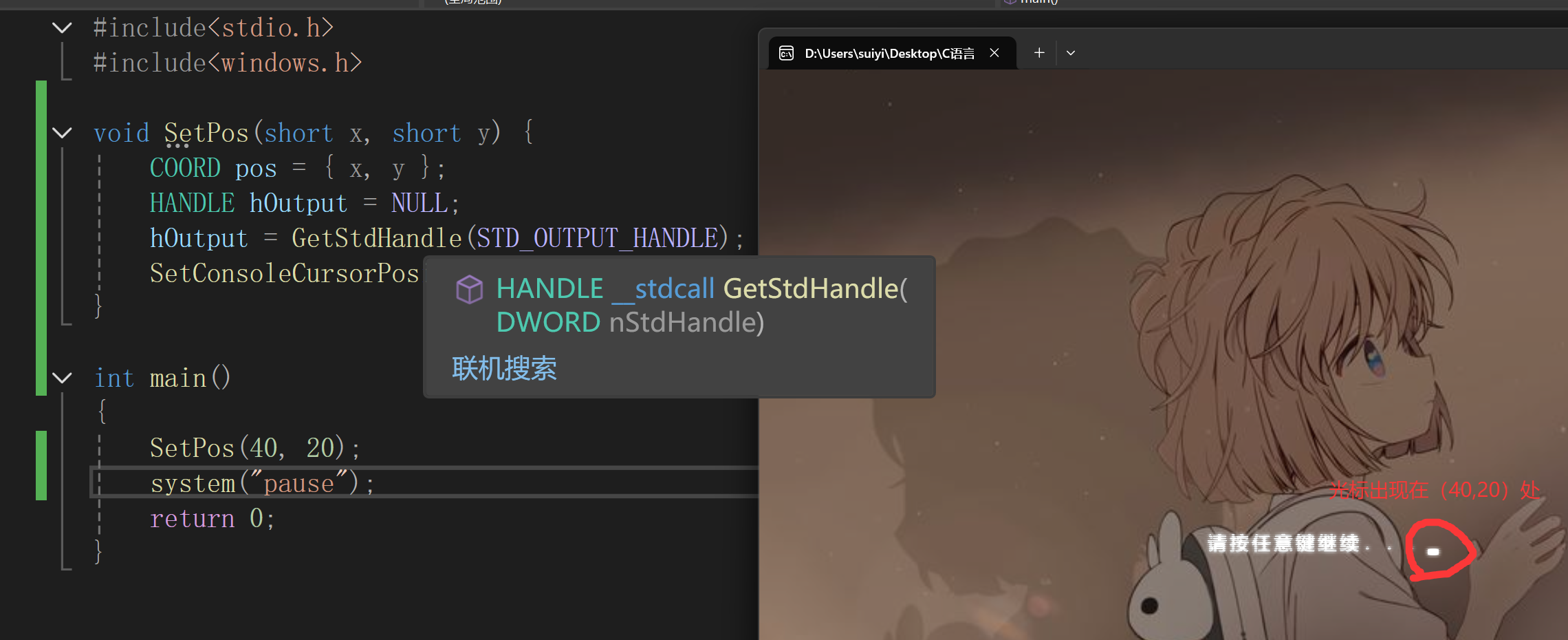 }COORD是一个结构体,表示坐标点。SetConsoleCursorPosition就是我们的"定位器",告诉系统下次输出应该从哪个位置开始。
