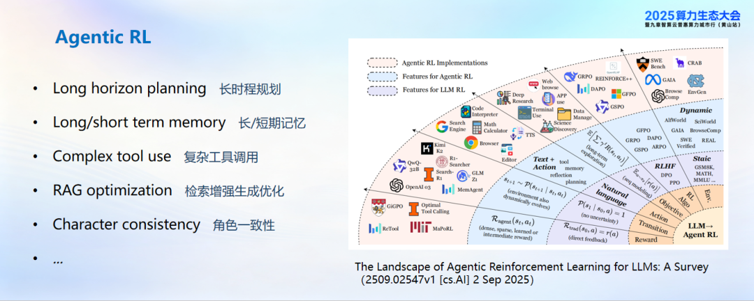 正是为了支撑这种「从生成到控制」的能力跨越,在 2025 算力生态大会上,九章云极 AI 首席科学家缪旭进一步展示了其强化学习云背后的 Agentic RL 技术架构。