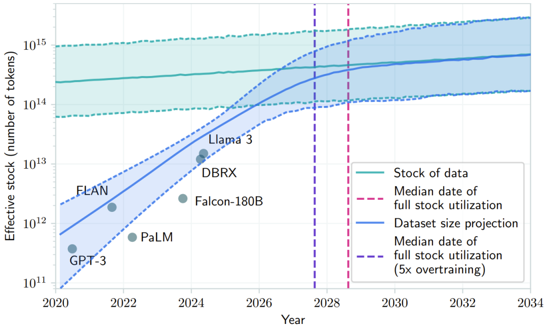 那时候,尽管英伟达的股价还在狂飙,但多方信源显示,包括彼时备受期待的 Orion(原计划的 GPT-5)在内,新一代旗舰模型在单纯增加参数规模和训练数据后,并未展现出预期的边际效益提升。另外,也有研究认为预训练所需的数据将会很快耗尽,其甚至还预测了明确的时间节点:2028 年。