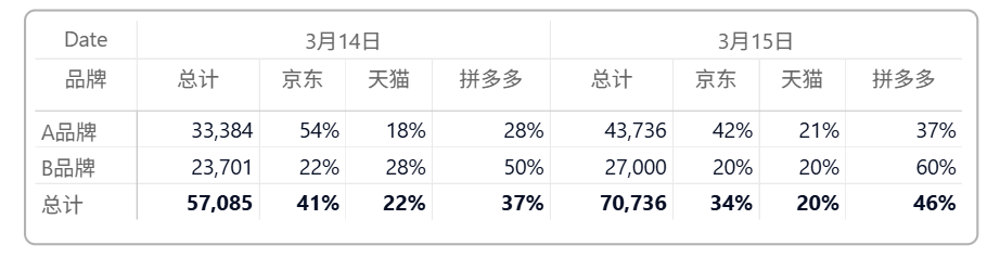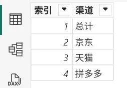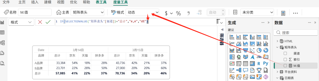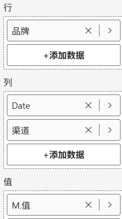 矩阵如下拖拽字段,品牌、日期来自于原模型,渠道来源于该矩阵表头表。