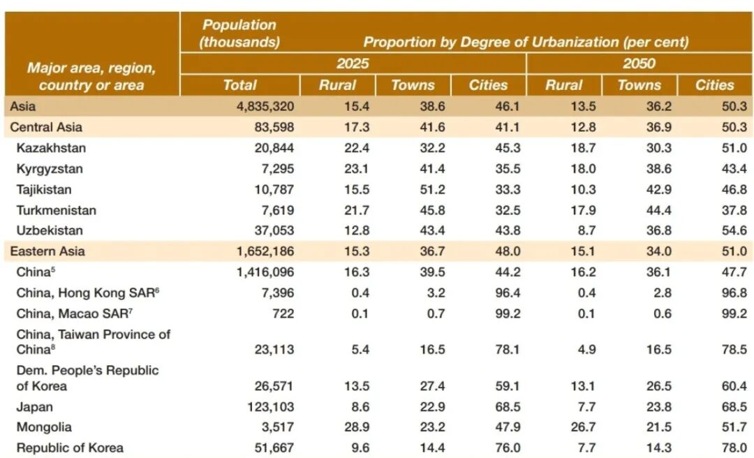在联合国发布的一份城市化报告中,有这么一个表格,非常刁钻:总计在最前方体现绝对值,分类(城镇还是农村)在后,体现占比。