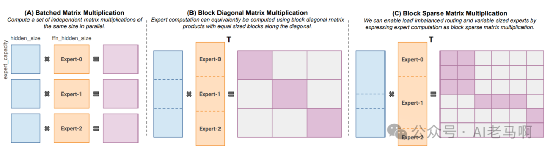 核心思想: MegaBlocks解决一个GPU上有多个专家,如何实现高效没有限制路由策略的MoE。