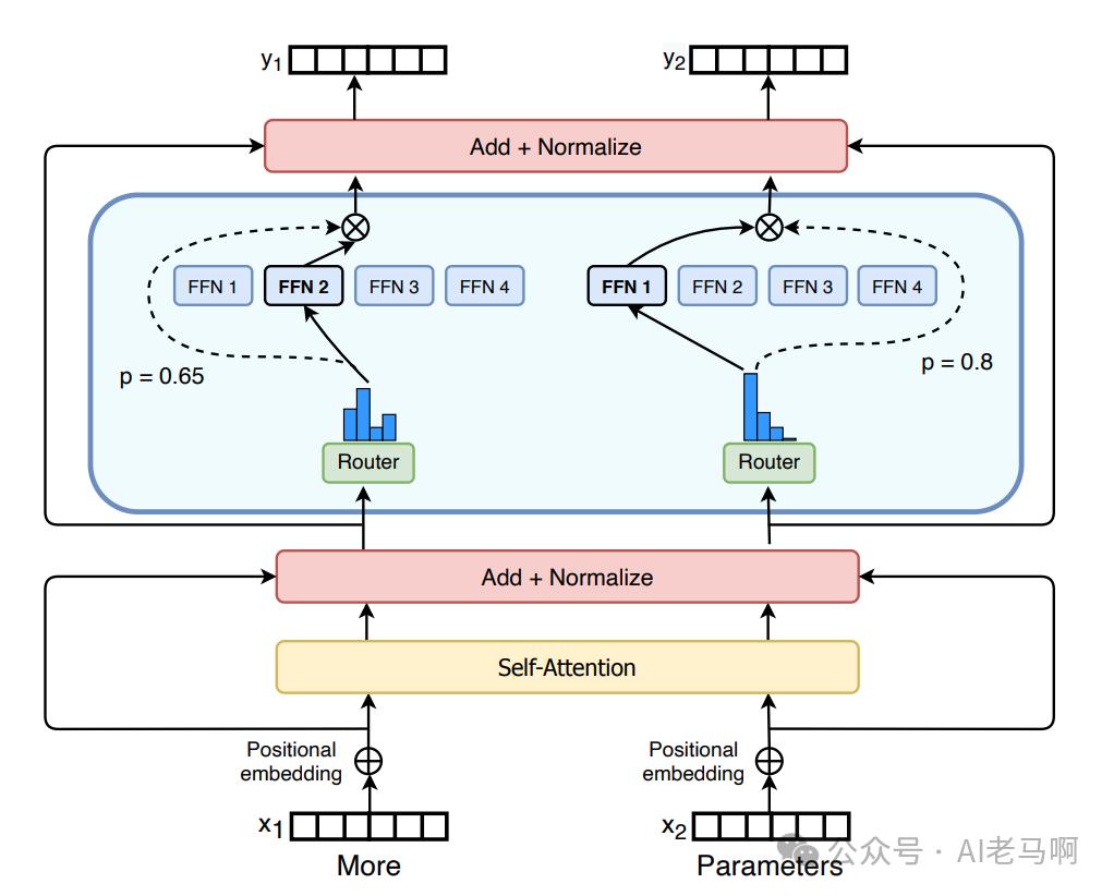 公式1表示N个专家系统的求和过程。公式2是路由器的具体计算过程。W表示路由权重矩阵,由softmax处理后获得样本x,被分配到每个expert 的权重,然后只取前 k 的最大权重。