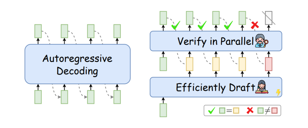 由定义可知,投机解码主要由两部分组成:Drafting 草稿模型和 Verification验证规则。