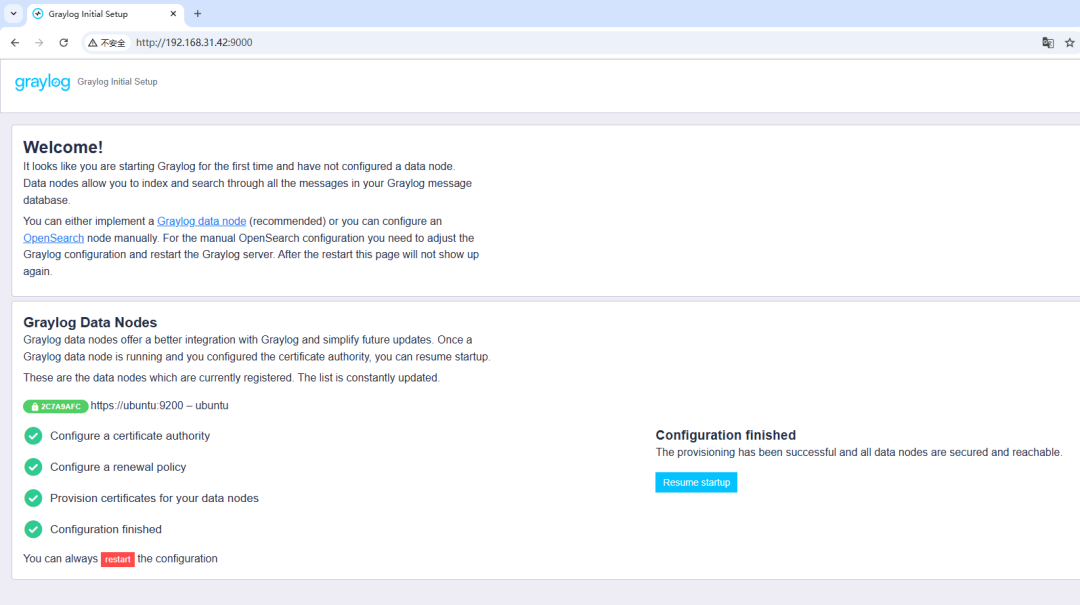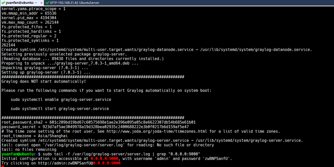 #请根据最后graylog-server日志文件最后显示的登录账号与密码后,在浏览器登录Graylog Web界面进行Graylog初始化