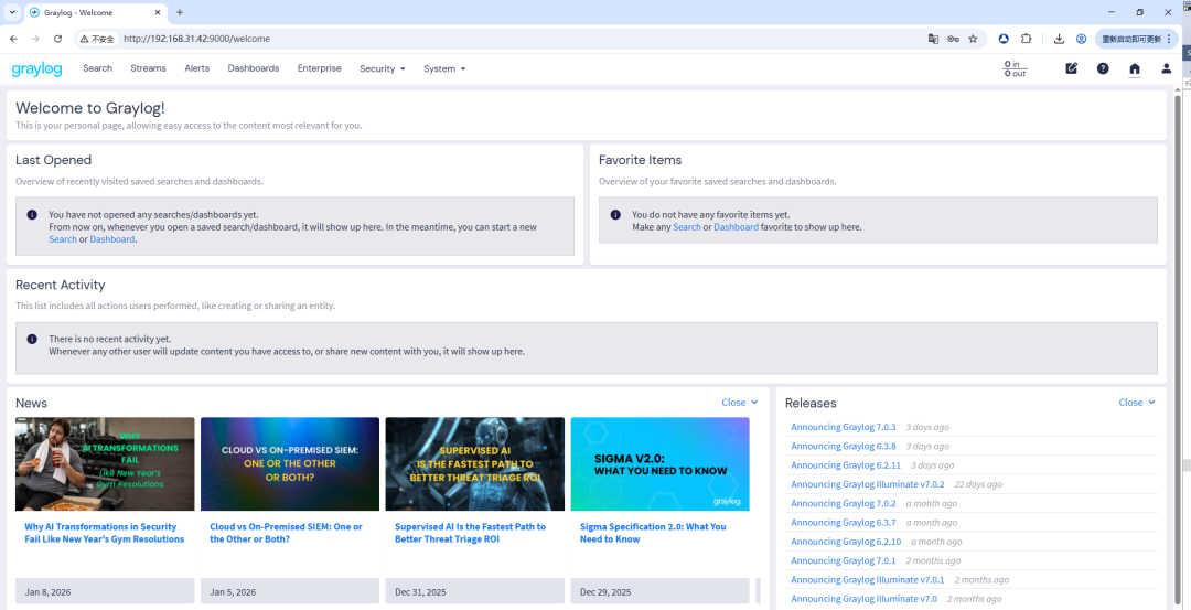 请根据最后graylog-server日志文件最后显示的登录账号与密码后,在浏览器登录Graylog Web界面进行Graylog初始化