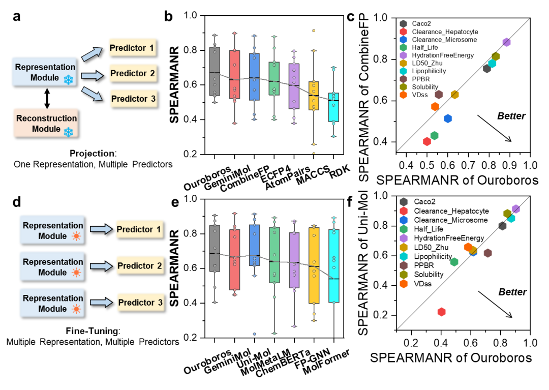 基于这样的框架,Ouroboros可以被广泛的无缝嵌入到各类下游任务模型中,赋予这些下游任务模型优化小分子结构的能力。更重要的是,Ouroboros 所展示的并不仅是一种模型结构,而是一种“表征–生成一体化”的设计范式。它表明,分子基座模型不必在理解与创造之间做出取舍,而是可以通过合理的结构设计,让二者在同一化学认知体系中共存。
