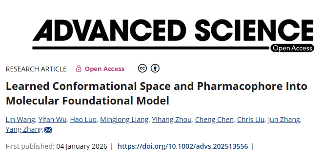 L Wang, Y Wu, H Luo, M Liang, Y Zhou, C Chen, J Liu, J Zhang, Y Zhang. “Learned Conformational Space and Pharmacophore Into Molecular Foundational Model.” Advanced Science (2026): e13556.