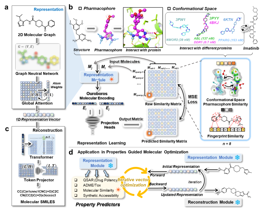 近日,苏州系统医学研究所–新加坡国立大学张阳教授团队在《Advanced Science》发表研究,提出了一种新的分子“基础模型”,探索如何在同一个 AI 框架中同时实现分子理解与分子设计。该工作以“Ouroboros(衔尾蛇)”为设计理念,构建了一种“编码—重建”式的正交架构,将分子表征学习与分子生成统一到同一个潜在空间中:模型先利用图神经网络学习具有化学意义的分子表示,再通过 Transformer 将这些表示重构为具体分子结构。更进一步,研究在训练过程中显式引入分子构象空间与药效团相似性约束,使模型在学习统计规律的同时,能够内化关键的药物化学知识。实验结果表明,Ouroboros 在虚拟筛选、多靶点分子设计、性质预测和定向分子优化等多类任务中展现出良好的泛化能力,为 AI 迈向真正“可设计”的分子基础模型提供了一种统一而可扩展的新思路。