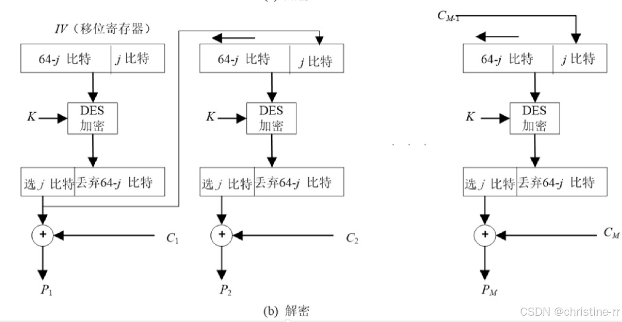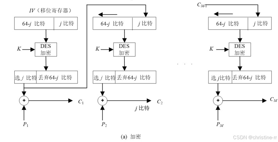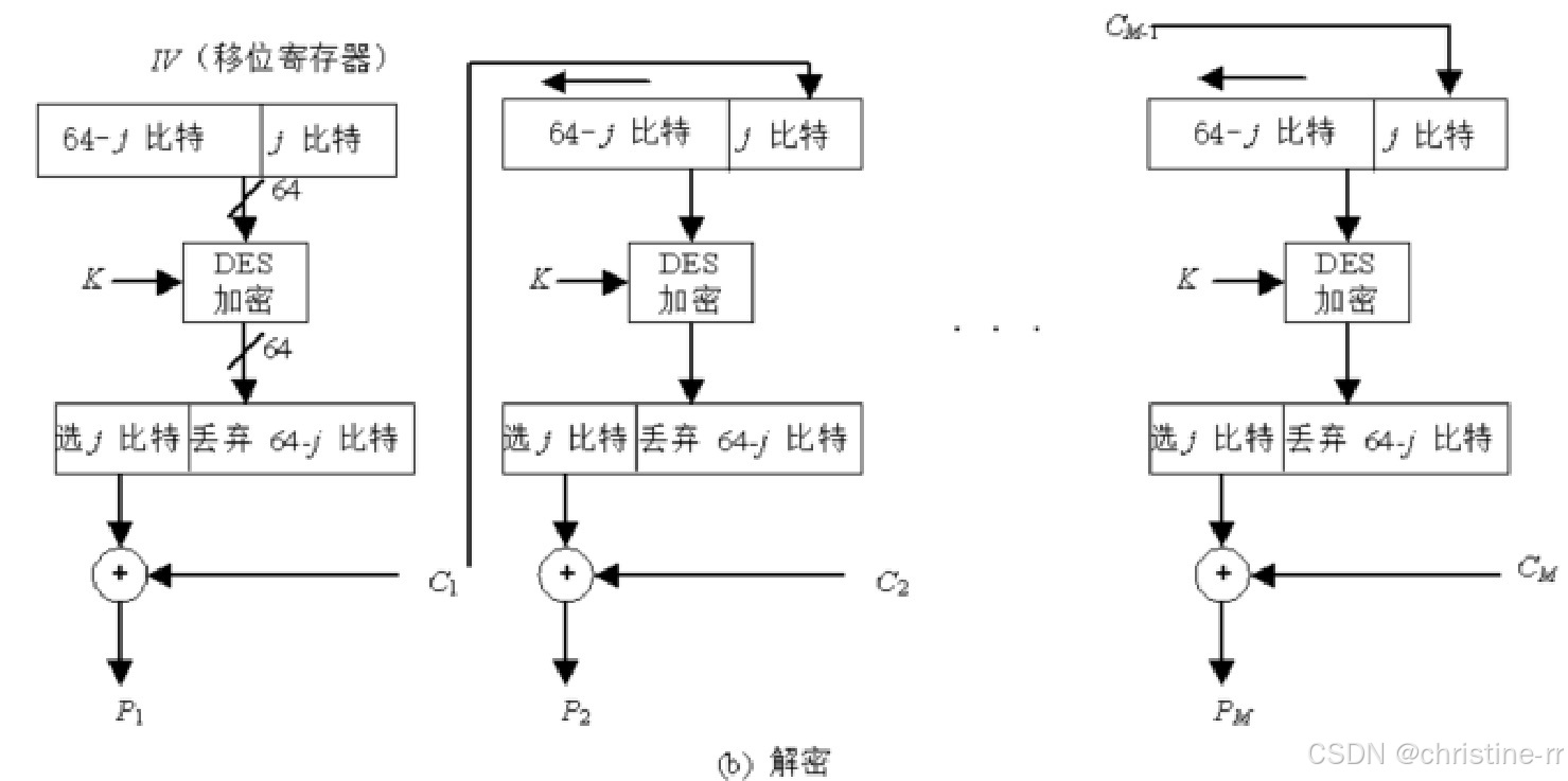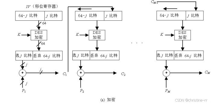 CFB加密时,加密算法的输入是64比特移位寄存器,其初值为某个初始向量IV。加密算法输出的最左(最高有效位) 比特与明文的第一个单元 异或,产生出密文的第一个单元 ,并传送该单元。然后将移位寄存器的内容左移 位并将 送入移位寄存器最右边(最低有效位) 位。这一过程继续到明文的所有单元都被加密为止 解密时,将收到的密文单元与加密函数的输出进行异或。