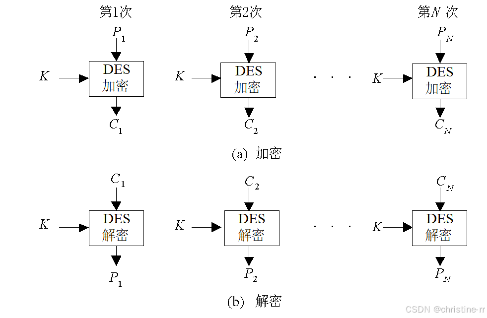将明文分组后,对每个64bit长的明文分组独立地使用相同的密钥进行加密,得到密文分组。相同的明文分组会产生相同的密文分组。
